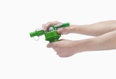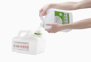 Attach the safety nozzle with adaptor to the e-NRG bottle and ensure it is securely fasten