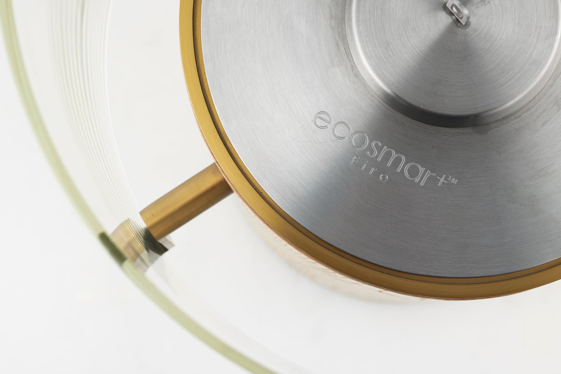 A glam, modern industrial-style, clean-burning indoor fire with side lamp-like aesthetic, including a Borosilicate glass ‘lampshade’ that surrounds the burner, allowing for an unobstructed view of the dancing flame.
